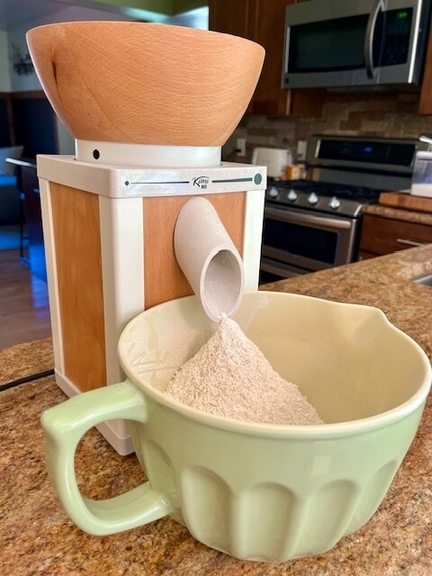 If you’re sticking with store-bought flour, feel free to skip ahead. But if you are curious … what is freshly milled flour? You will find the answer here.  Or if you are wondering why anyone would go through that extra work of making flour?  Well, freshly milled flour isn’t just “flour.” It’s full-of-nutrition flour that still has its bran and germ intact.  Milling your own flour might sound like a pioneer-level project, but here’s the fun surprise: it takes less than four minutes. Yes, really. It takes less time than finding your favorite baking playlist.