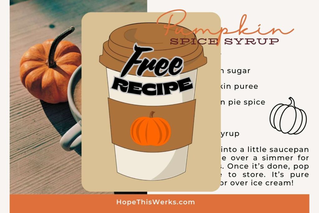 Don’t forget: If you want the recipe for pumpkin syrup for your coffee (and yes, it’s amazing over ice cream too) … then click here to get your FREE adorable recipe card with all the details.