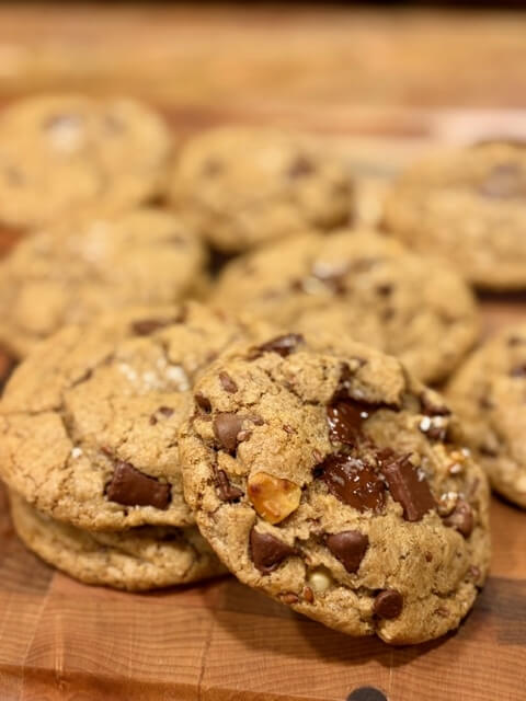 In fact, when I first started making these homemade chocolate chip cookies with freshly milled flour, I didn’t include nuts at all. That changed after my daughter and her husband went to New York City and brought me home a chocolate chip cookie from Levain Bakery. That cookie had walnuts in it. And shockingly, for the first time in my life, the nuts made the cookie better.