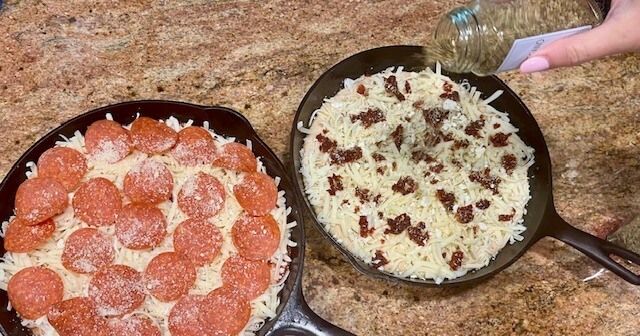 - Prep the Pans. Grab two 10" cast iron pans. Add 3 tablespoons of olive oil into each (don't be shy). Swirl around to coat the sides and bottoms.